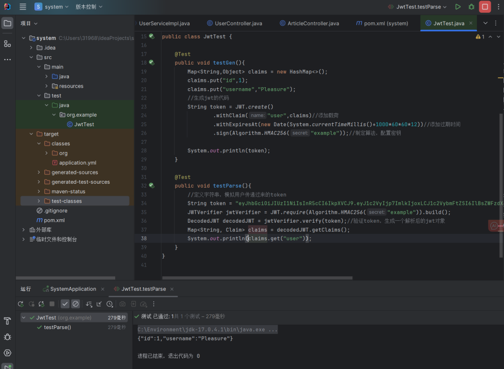 生成令牌由登录接口文件来实现,而验证令牌由系统内部文件来实现,这里就以ArticleController.java文件为例来实现。