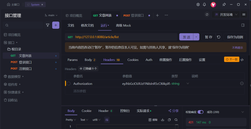 可以看到在数据包的Header部分不添加生成的Authorization JWT登录令牌时,就会返回401登录错误。