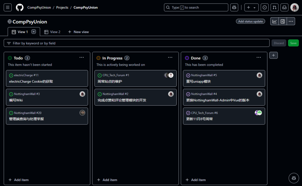 - 任务跟踪:项目中的问题(Issues)和拉取请求(Pull Requests)可以直接添加到项目中,方便团队跟踪任务进展。