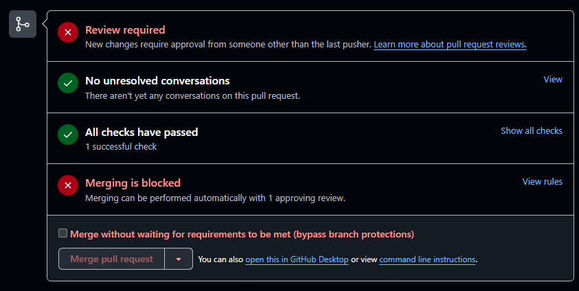 只有点击Merge without waiting for requirements to be met (bypass branch protections)才能进行合并