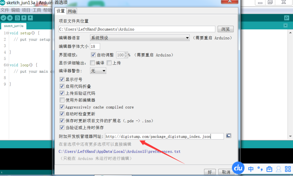 如上图所示,点击文件 首选项 在附加开发板管理器网址中输入:http://digistump.com/package_digistump_index.json