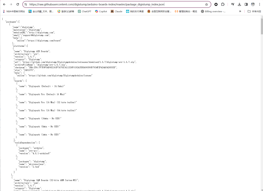 这里我想说明一下,我查了一些资料,发现网上清一色的都是用的这个网址。其实这个网址只是为了方便国内的网友不方便翻墙而进行重定向的一个网址,实际指向的是这个:https://raw.githubusercontent.com/digistump/arduino-boards-index/master/package_digistump_index.json