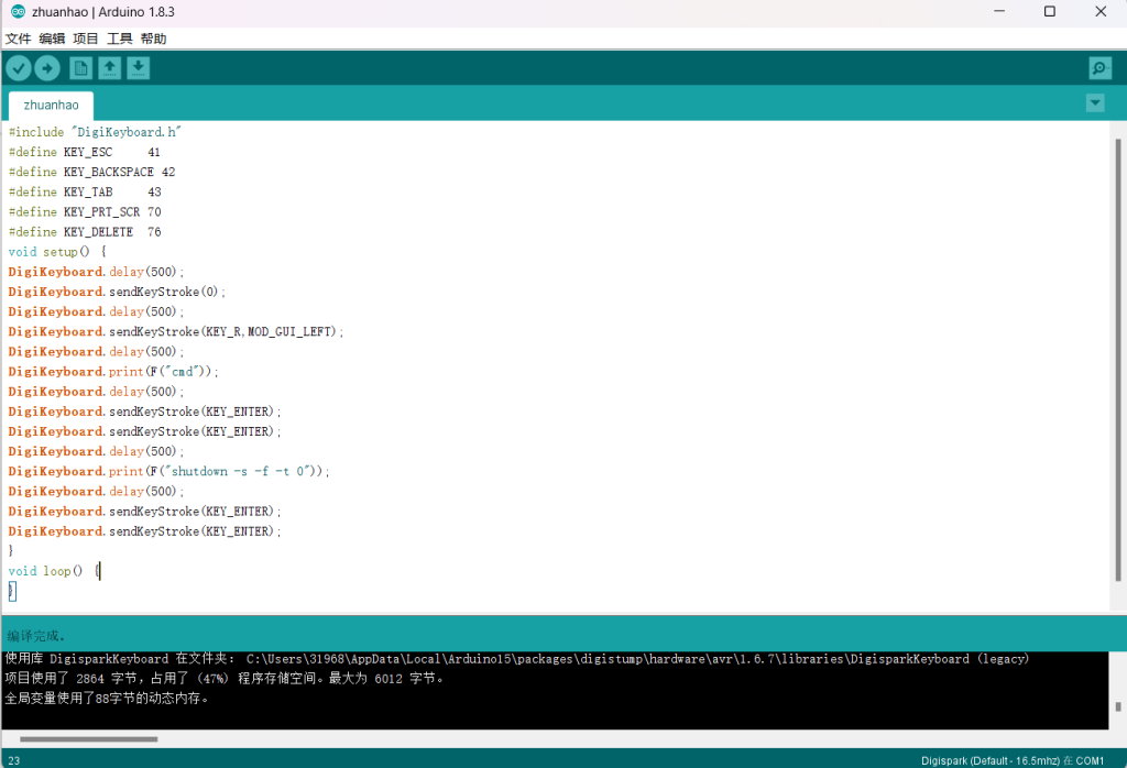 这样,你就可以以此类推,将badusb scripts换做其他的内容,或是借用其他的库(比如说控制鼠标的mouse.h),来实现你的伟大抱负。
